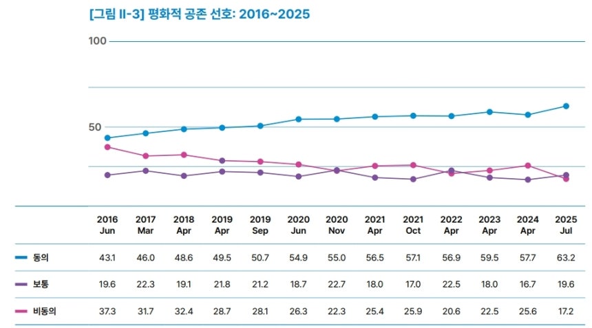 평화적 공존뿐만 아니라 현재와 같은 '적대적 공존'에 대해서도 선호도가 다소 높아지는 경향이 관찰됐다.