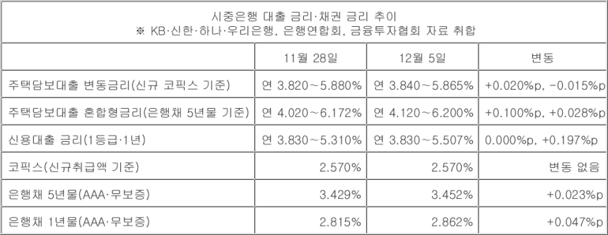 특히 주택담보대출 변동 금리의 경우 상단이 0.241%p 올랐는데, 이는 변동 금리의 주요 지표 금리인 코픽스 상승 폭(0.050%p)의 약 5배에 이른다.