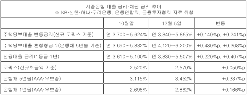 여기에 연말 가계대출 총량 관리 차원에서 은행들이 임의로 덧붙이는 금리 폭도 커지면서, 실제 대출금리 인상 폭이 은행채·코픽스(COFIX) 등 지표금리 상승 폭을 크게 웃도는 현상도 뚜렷하다.