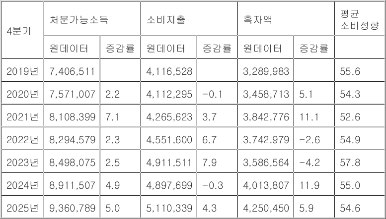 특히 2024년 4분기는 전년 동기 대비 2.8%p 떨어지며 가장 큰 폭의 하락세를 보였는데, 이때 소득은 늘었으나(3.7%), 소비지출은 소폭 줄어든(-0.3%) 영향이 컸다.
