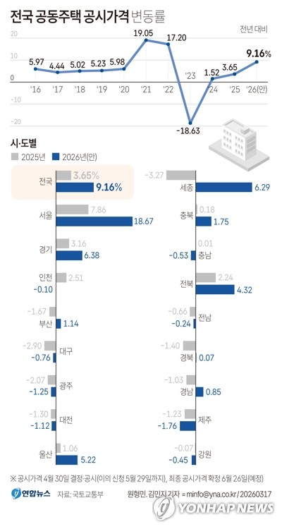 올해 전국 공동주택 공시가격은 작년 대비 평균 9.16% 상승했다. 상승률은 지난해(3.65%)와 2024년(1.52%)을 크게 웃도는 수준으로, 2022년(17.20%) 이후 가장 높다.