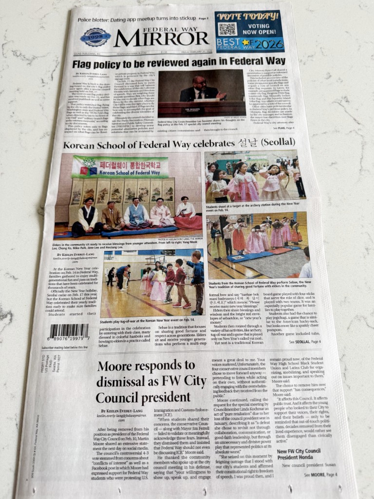 페더럴웨이 통합한국학교(이사장 박영민·교장 이재은)가 지난 2월 14일 TAF@Saghalie에서 개최한 ‘설날 한마당잔치’가 주류신문 Federal Way Mirror 1면에 소개되며 지역사회 안에서 한국 전통문화 교육의 의미를 널리 알렸다. 특히 신문 1면에 한국어 ‘설날(Seollal)’이 크게 실리면서 지역사회 속 한국학교의 위상과 문화적 영향력을 보여주는 상징적인 장면으로 평가받고 있다.