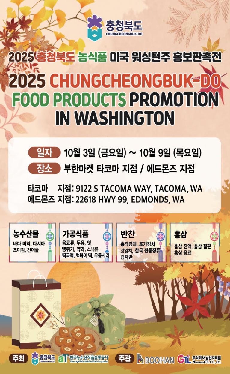 한국 충청북도의 건강한 먹거리를 한자리에서 만날 수 있는 특별한 기회가 찾아온다. 오는 10월 3일(금)부터 10월 9일(목)까지, 부한마켓 타코마 지점과 에드몬드 지점에서 동시에 열리는 충청북도 직송 농식품 특별전은 한국의 맛과 정성을 그리워하는 한인들의 마음을 따뜻하게 달래 줄 예정이다.