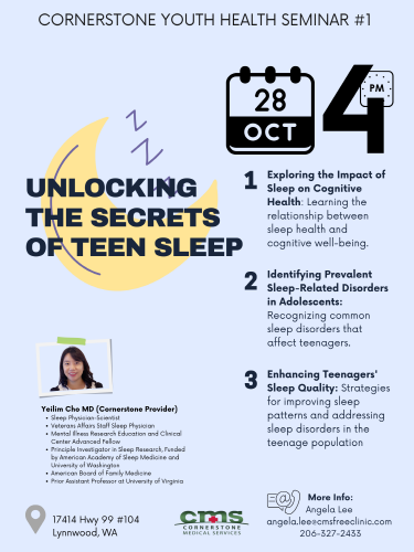 코너스톤은 우리 지역 사회의 최초이자 유일한 무료 진료소로 그동안 정기적으로 강연과 세미나를 개최해 왔는데 이번 10월에 열리는 커뮤니티를 위한 코너스톤 클리닉의 세미나는 특별히 우리 지역 사회 내의 중, 고등학생을 대상으로 한다. 현재 워싱턴 주립대에서 수면 연구 및 수면장애로 인한 질병들을 치료하는 가정의학과 의사이자 연구원인 조예림 의사가 강연할 예정이다. 조예림 의사는 코너스톤 페더럴웨이 무료 진료소에서 자원봉사를 하는 의사이다.