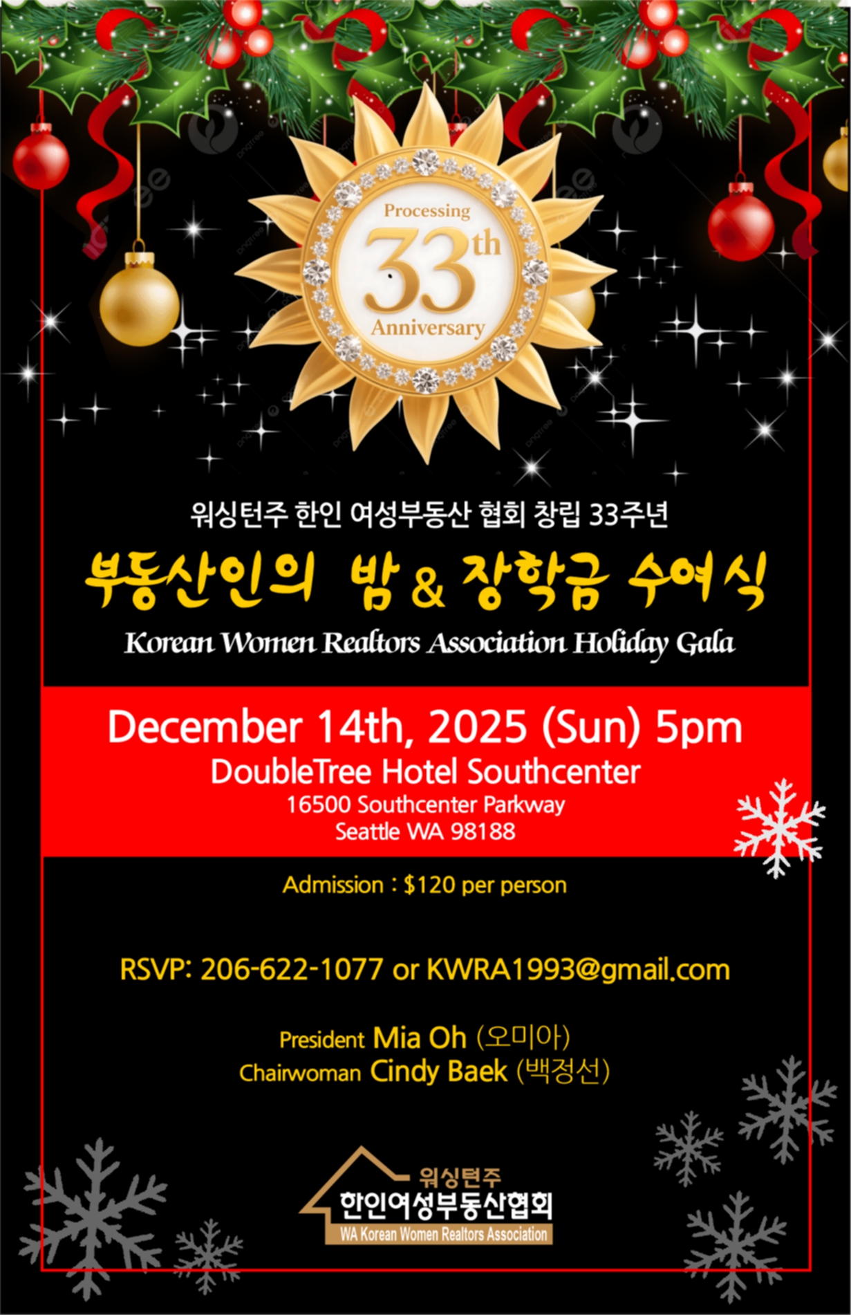 워싱턴주 한인여성부동산협회(회장 오미아·이사장 백정선)가 창립 33주년을 맞아 오는 12월 14일(일) 오후 5시, 더블트리 호텔 사우스센터(DoubleTree Hotel Southcenter, 16500 Southcenter Parkway, Seattle, WA 98188)에서 ‘부동산인의 밤 & 장학금 수여식’을 개최한다. 이번 행사는 한 해를 마무리하며 지역사회 공헌과 부동산업계 회원들의 노고를 기념하는 동시에, 차세대 한인 인재들을 위한 장학금 지원을 실시하는 뜻깊은 자리로 마련된다.