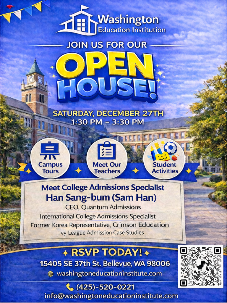 미국 명문대들의 합격률이 사상 최저 수준으로 떨어지며 입시 경쟁이 한층 치열해진 가운데, 워싱턴주 벨뷰에서 학부모들의 관심을 집중시킬 대입 전략 세미나가 열린다. 워싱턴 교육원(WEI)은 오는 12월 27일 오후 1시 30분, 교육원 컨퍼런스 룸에서 ‘아이비리그 및 영미 명문대 입시 전략 세미나’를 개최한다고 밝혔다.