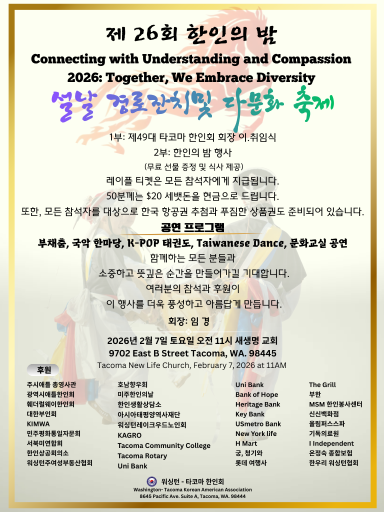워싱턴주 타코마에서 한인사회의 화합과 연대를 다지는 뜻깊은 자리가 마련된다. 워싱턴–타코마 한인회는 오는 2월 7일(토) 오전 11시, 타코마 새생명교회에서 제26회 ‘한인의 밤’ 행사를 개최한다.