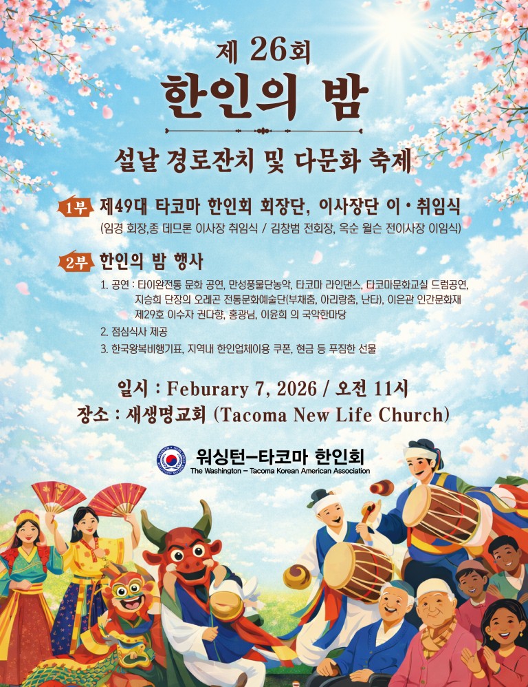 워싱턴주 타코마 한인사회 최대 연례행사로 자리매김한 ‘한인의 밤’이 올해로 26회를 맞아 다채로운 문화축제와 함께 개최된다. 워싱턴-타코마 한인회(회장 임경, 이사장 종 데므론)는 오는 2월 7일(토) 오전 11시, 타코마 새생명교회(Tacoma New Life Church)에서 ‘제26회 한인의 밤(The 26th Korean Night)’ 행사를 열고, 제49대 한인회 회장단 및 이사장단의 이·취임식을 겸해 지역 동포들과 함께하는 화합의 장을 마련한다고 밝혔다.