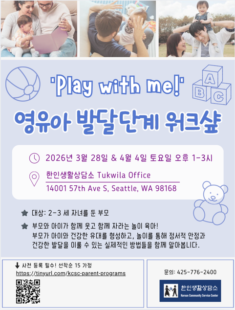 한인생활상담소(소장 김주미)가 2~3세 자녀를 둔 부모를 위한 ‘Play With Me’ 부모 워크숍을 개최한다. 이번 워크숍은 오는 3월 28일과 4월 4일 두 차례에 걸쳐 토요일 오후 1시부터 3시까지 터퀼라에 위치한 한인생활상담소 남부지소에서 대면으로 진행된다.
