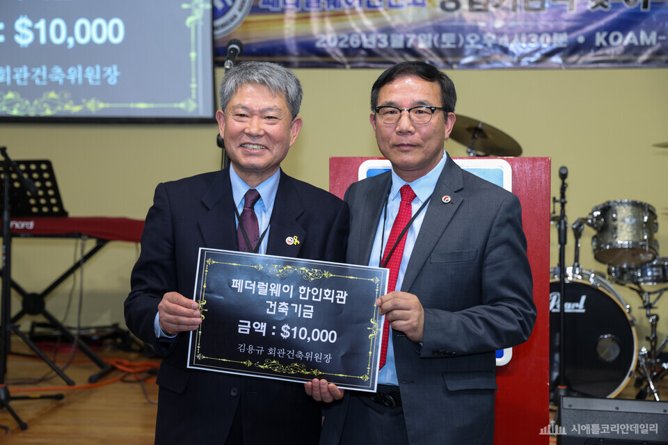 페더럴웨이 한인회관 건립의 꿈을 묵묵히 이어온 사람이 있다. 제3대 및 제16대 이사장을 지낸 김용규 페더럴웨이 한인회관 건축위원장이다. 그는 3월 7일 코앰(KOAM)-TV에서 열린 페더럴웨이 한인회 창립 17주년 기념식 및 이취임식에서 류성현 신임 회장에게 1만 달러의 건축기금을 전달했다.