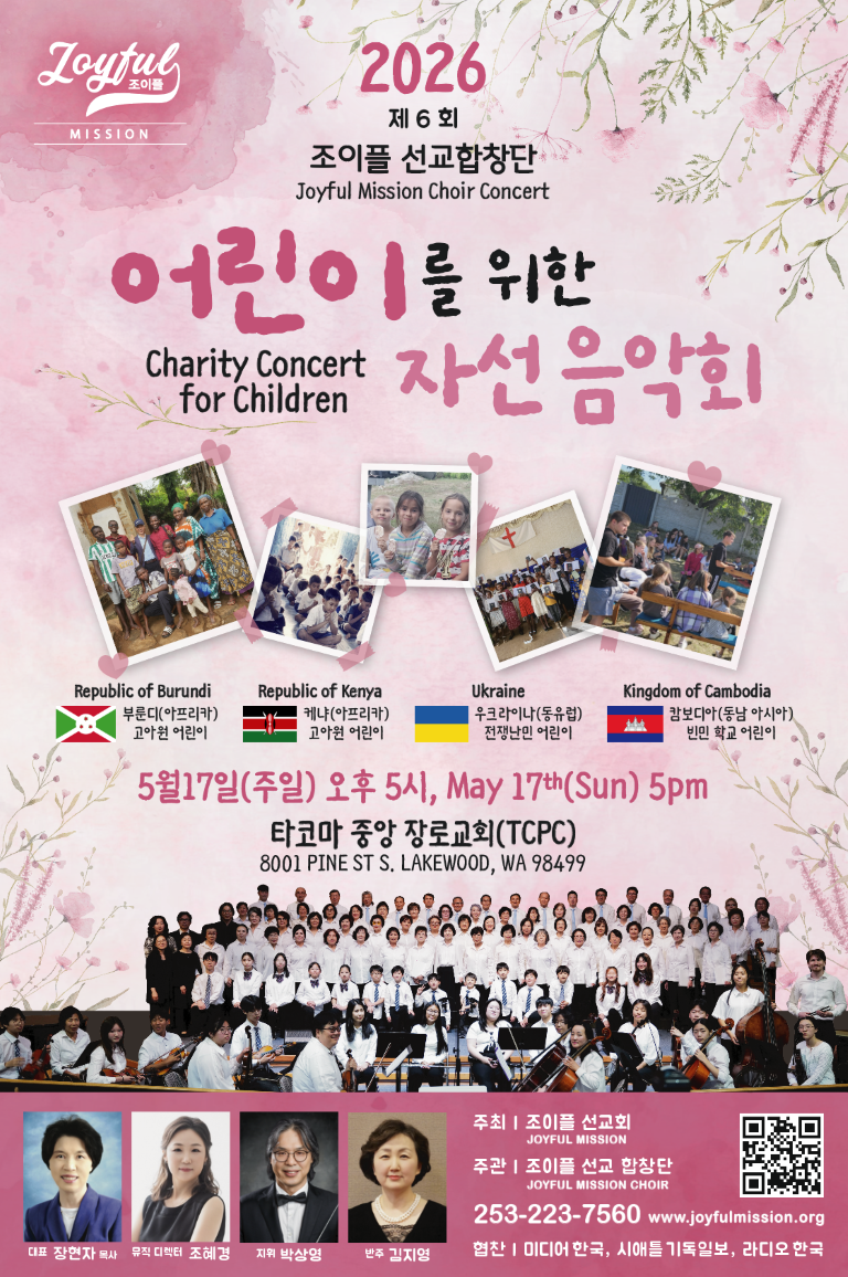 조이플 선교합창단이 오는 5월 17일(주일) 오후 5시, 타코마중앙장로교회(담임 이형석 목사)에서 제6회 자선음악회를 개최한다. ‘어린이를 위한 자선음악회(Charity Concert for Children)’라는 주제로 열리는 이번 공연은, 어려운 환경 속에서 살아가는 해외 어린이들을 돕기 위한 나눔과 선교의 무대로 마련된다.