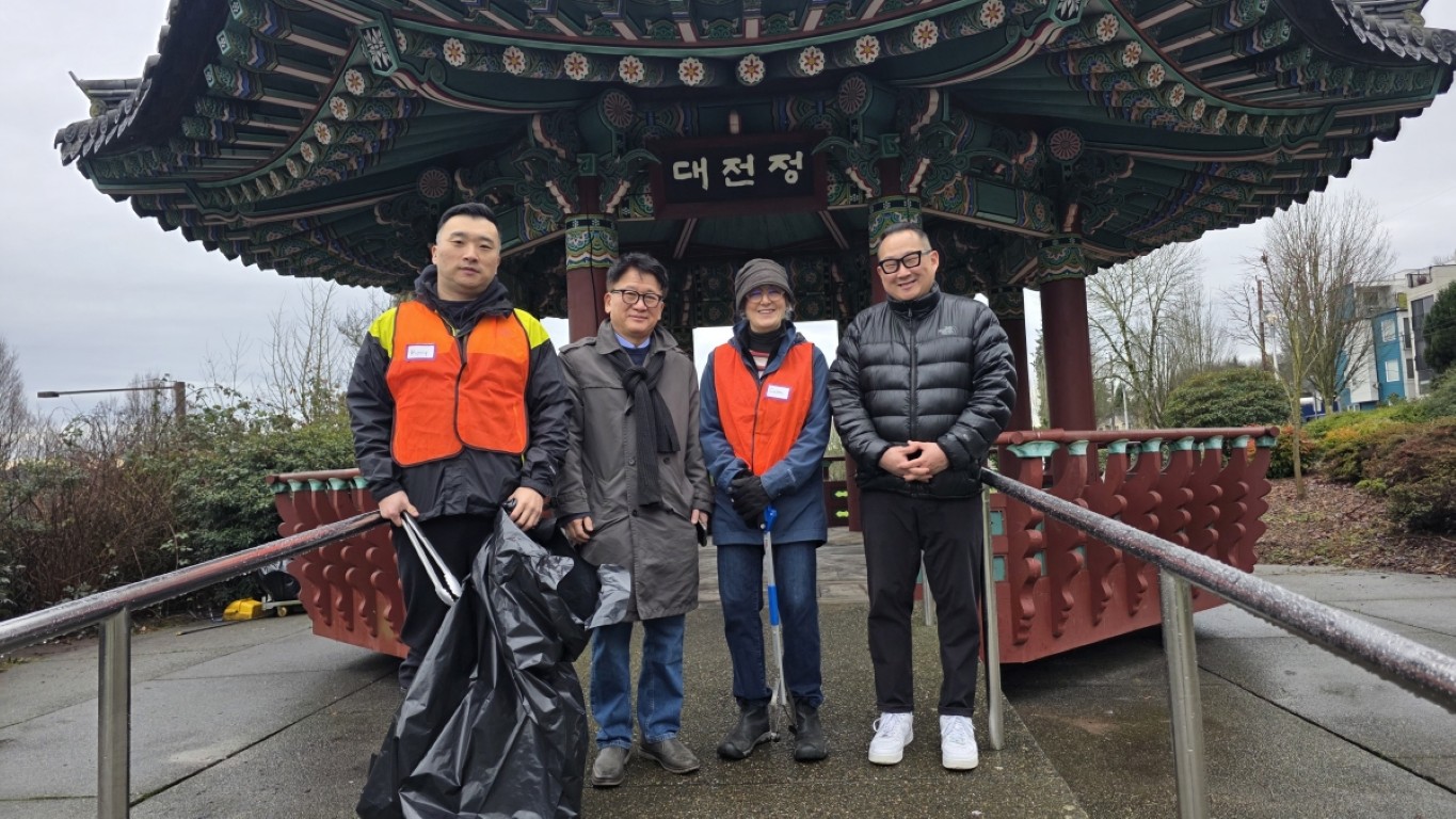 1. 광역시애틀한인회 김원준 회장(왼쪽에서 2번째) 등 임원들이 대전정위원회 코리 한 위원장과 대전정 청소를 마친 후 기념촬영을 하고 있다.