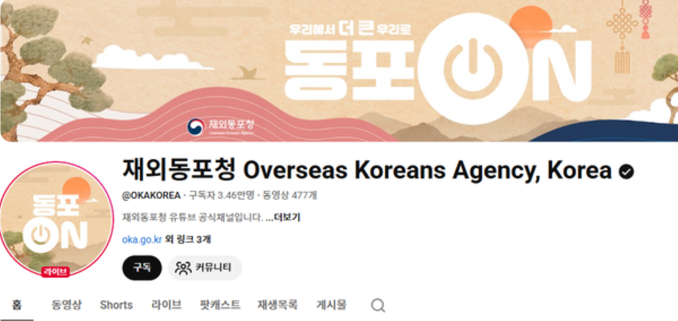 재외동포청(청장 김경협)은 2025년 11월 28일 기존 유튜브 채널을 전면 개편해 재외동포 전용 소통 플랫폼 '동포ON'(유튜브 @OKAKOREA)을 공식 출범시켰다. 동포ON은 전 세계 700만 재외동포를 대상으로 한국 뉴스와 동포 정책 소식은 물론, 한국어 교육, 케이팝, 시사·교양, 다큐멘터리 등 다양한 분야의 콘텐츠를 24시간 제공하는 '올인원' 방송 플랫폼을 지향한다.