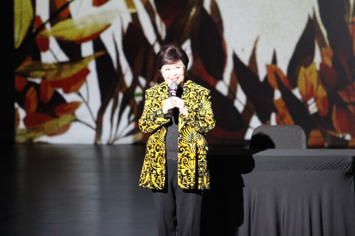 서정자 사장이 지난 2023년 9월 30일 어번 퍼포밍 아트센터에서 방송 인생 64주년을 기념해 열린 ‘방송 인생 나의 이야기’에서 인사를 하고 있는 모습. <미디어한국DB>