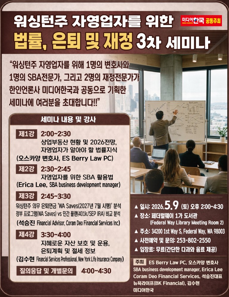 워싱턴주 한인 자영업자들을 위한 실무 중심 종합 세미나가 열린다. 한인 언론사 미디어한국과 지역 전문가들이 공동 주최하는 ‘워싱턴주 자영업자를 위한 법률, 은퇴 및 재정 3차 세미나’가 오는 5월 9일(토) 오후 2시부터 4시 30분까지 페더럴웨이 도서관(Federal Way Library Meeting Room 2)에서 ‧34200 1st Way S Federal Way, WA 98003)개최된다.